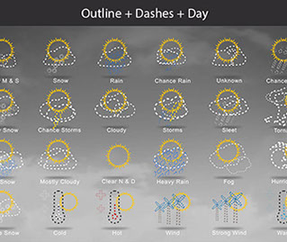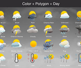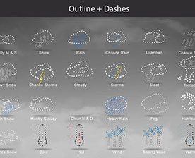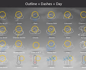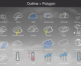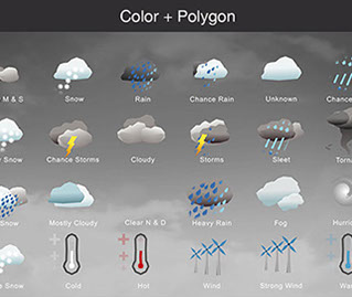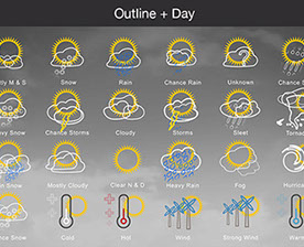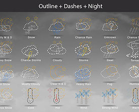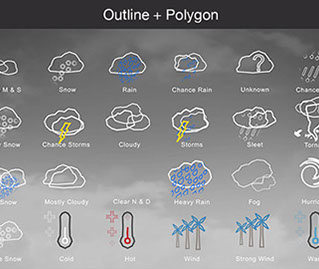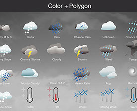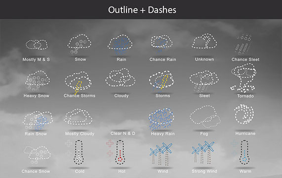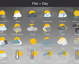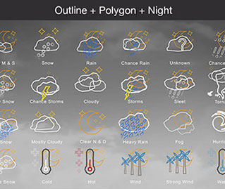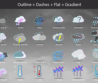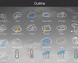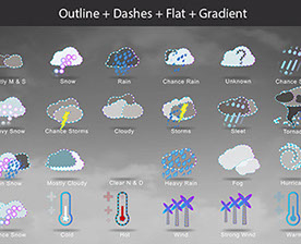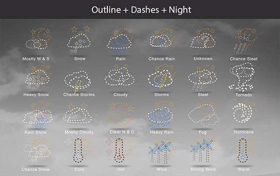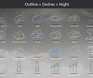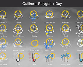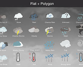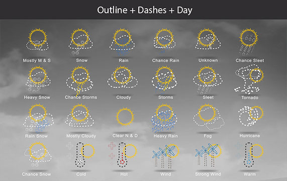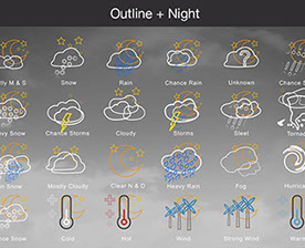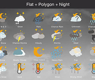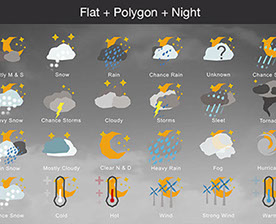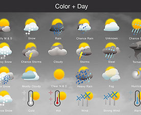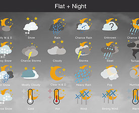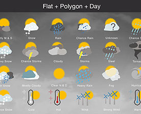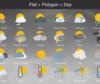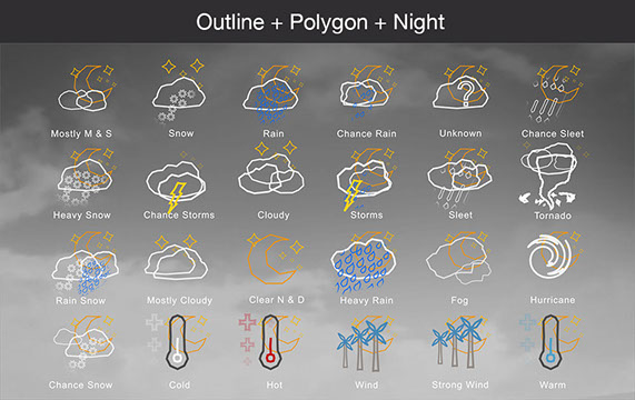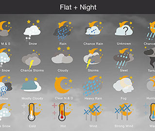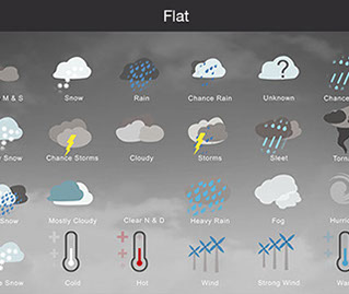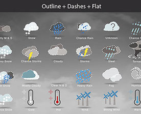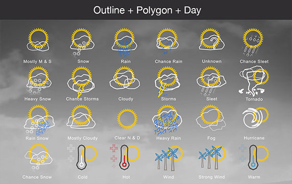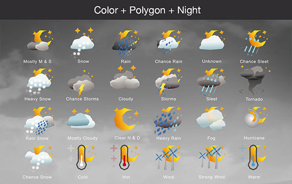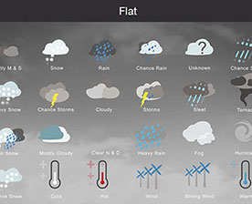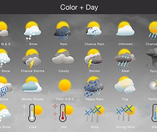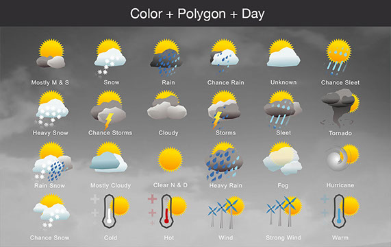 Mostly Sunny, Snow, Rain, Chance Rain, Unknown, Chance Sleet, Heavy Snow, Chance Storms, Cloudy, Storms, Sleet, Tornado, Rain Snow, Mostly Cloudy, Clear & Sunny, Heavy Rain, , Fog, Hurricane, Chance Snow, Cold, Hot, Wind, Strong Wind, Warm, and many other useful icons.